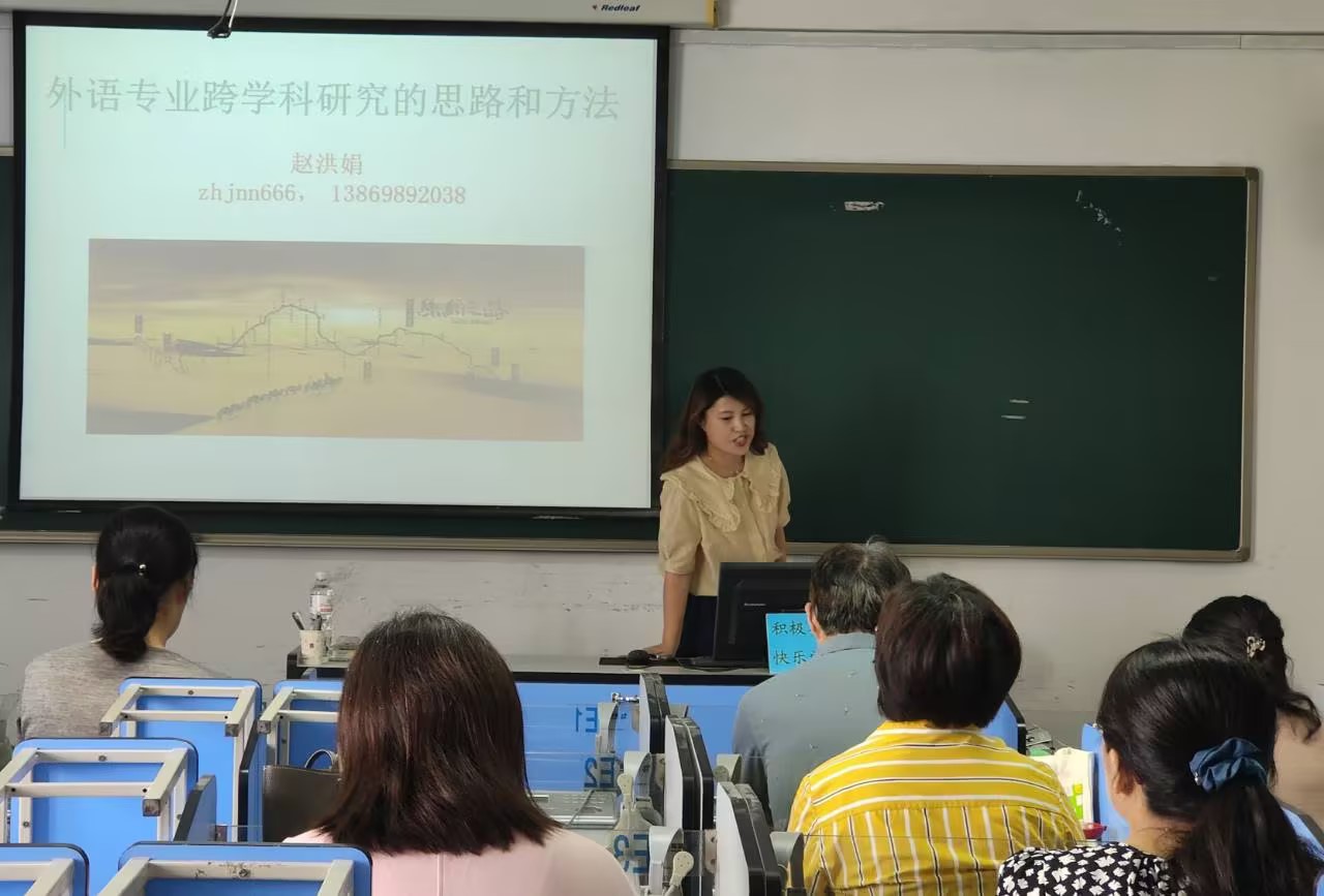 泰山学者青年专家赵洪娟教授作了《外语专业跨学科研究的思路和方法》的报告。赵洪娟在报告中指出外语专业、外语教师在发展中面临的困境和挑战,新文科跨学科、综合性、融通性的特征,外语专业跨学科交叉融合的路径。她强调新形势下高校外语教师可以利用人工智能、大数据、区块链等技术,充分发挥自身外语优势,开展“外语+”跨学科研究,让外语学科在讲好中国故事、提高中国国际话语权、助力中国参与国际治理等方面发挥重要作用。在报告中,赵教授还介绍了个人“一带一路”相关学术研究经历,分享了自己的成长感悟,勉励与会教师“心有大格局,方能立天地”,要有高远的目标追求,要下苦功夫,用付出和汗水赢得成功。