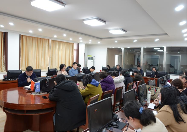 403(同声传译教室)举行集体学习,集体学习由学院党委书记曲斌艳主持,学院党委委员、学术委员会委员、支部委员会委员、系部和部门主任(正副职)、辅导员参加。