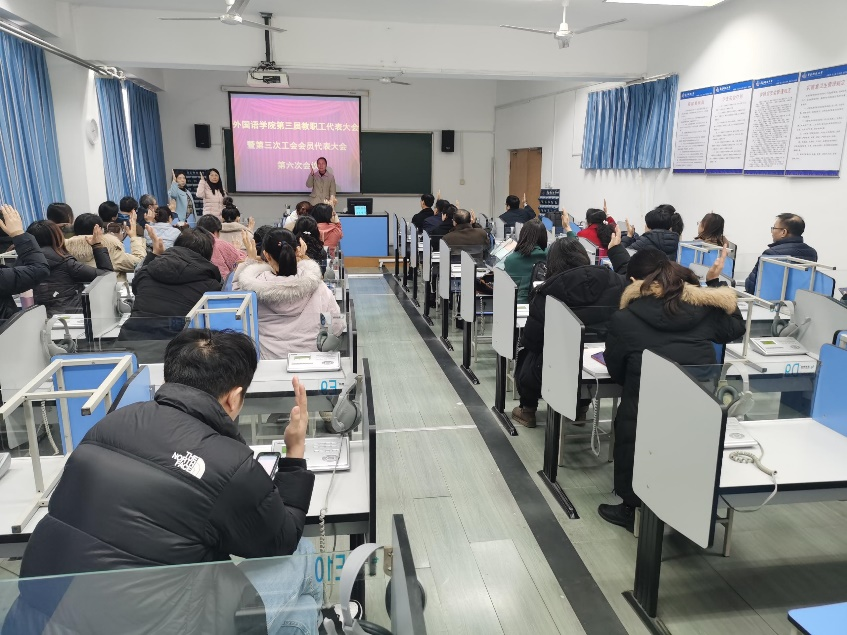 第三届教职工代表大会暨第三次工会会员代表大会第六次会议在418语音室召开,会议由学院党委书记曲斌艳主持。
