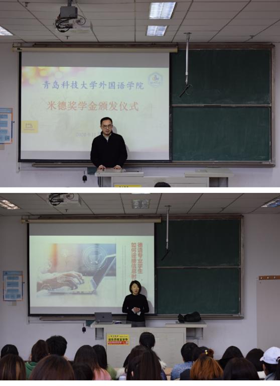 “米德在线”教学主管施旻皞代表校友李治感谢母校的培养,表达了公司对学校和德语教育的情怀,希望和学校一起为德语人才培养贡献一份力量。“米德在线”教学主管施旻皞和“米德”骨干教师曹冉共同为德语专业优秀学生颁发了奖学金证书及奖品,并向德语系和四个班级捐赠了德语原版书籍和德语学习材料,同时表示愿意继续帮助充实德语系的图书及影音资料。颁奖仪式后,曹冉老师为德语系学生举行了“德语专业学生如何迎接信息时代的挑战”的讲座。