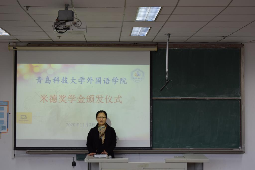 曲斌艳代表学院为仪式致辞,对校友李治和米德团队在业界取得的成绩表示祝贺,高度评价他们利用自身所学,结合社会发展形势和需求,打造高品质网络课程,塑造全新、高效的在线教学模式,为社会输送具备语言特长的行业精英,是青岛科技大学人才培养的成果服务社会、推动社会发展的具体体现。同时,李治及团队心怀感恩、回馈学校、回馈教育、回馈社会,这是母校落实立德树人的根本任务的充分体现。同时曲斌艳对德语系在校学生寄予期望,希望他们看到知识的价值,看到成长的空间,更关键的是看到将来应该做一个怎样的人,希望他们沿着学长的足迹,成长为推动社会更好发展的新生力量。