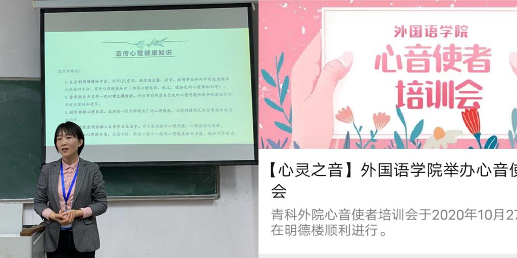 为了时刻掌握同学们的心理健康状况,更为了积极配合学校心理健康中心的工作,我院在各个班级设置了心理委员以及心音使者,对存在问题的同学及时给予帮助,在专业学习、新生人际关系、感情问题等方面进行了心理辅导。为充分发挥班级心理委员,心音使者和宿舍舍长的作用,了解同学们日常生活情况,我院邀请学校心理中心主任李海玲老师对学院心音使者进行培训,解答新生入学后经常遇到适应问题,宿舍人际关系问题等,给予具体的心理辅导。充分发挥新媒体平台的作用。此外,我院还充分利用新媒体平台,通过学院微信公众号,微博等平台推送心理健康知识,普及同学们对心理健康常见问题的了解。