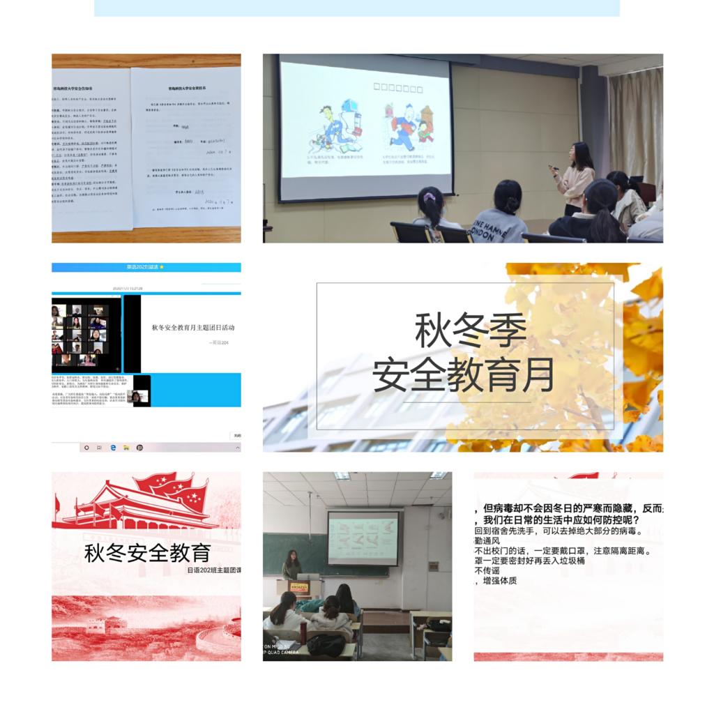 为切实做好秋冬季安全教育工作,11月6日,召开秋冬季安全教育月主题教育,针对秋冬季疫情防控、传染病防治、宿舍用电安全等方面进行宣传教育,全方位为学生解读《青岛科技大学安全告知书》,引导学生增强安全责任意识,增强自我防护能力。学院各团支部积极响应号召,召开线上线下主题团日,向学生宣传普及疫情防控知识,引导学生将疫情防控安全责任内化于心,外化于行,激发学生责任担当。