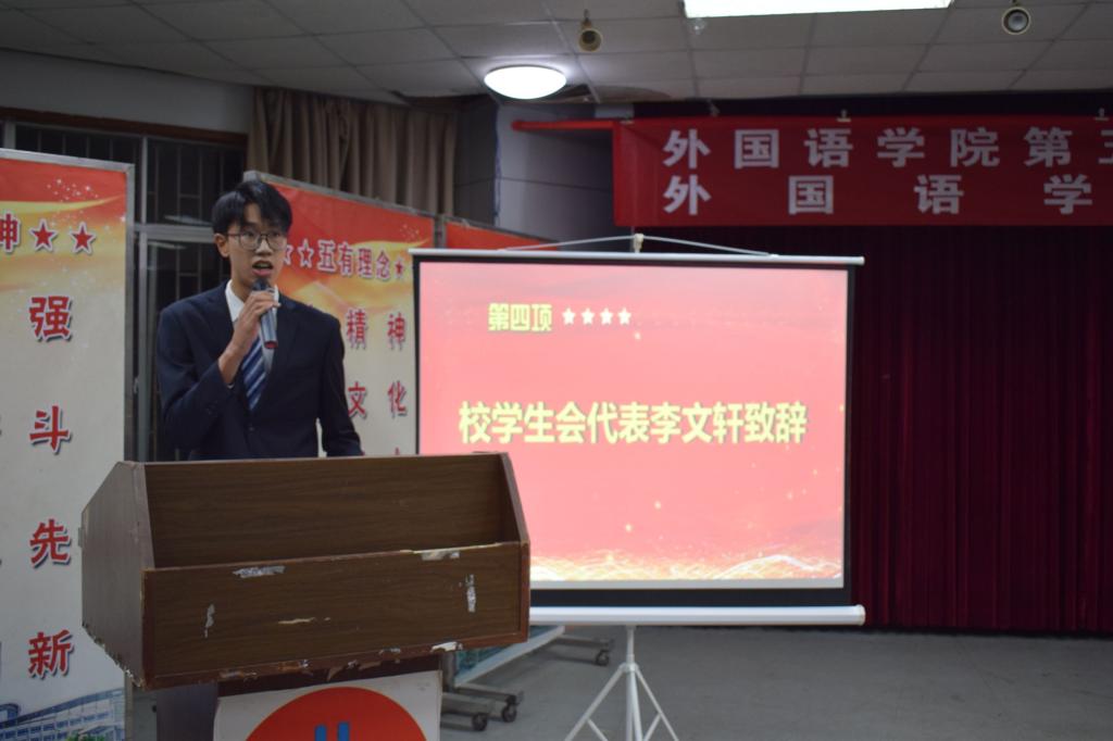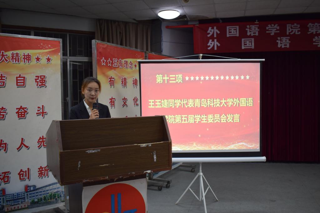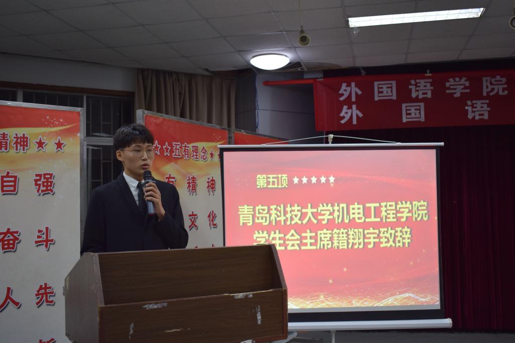 工作人员宣读来自各个兄弟学院学生会发来的贺电、贺信。青岛科技大学崂山校区学生会代表李文轩向大会的召开表示热烈祝贺。机电学院籍翔宇作为兄弟学院代表向大会致贺词。