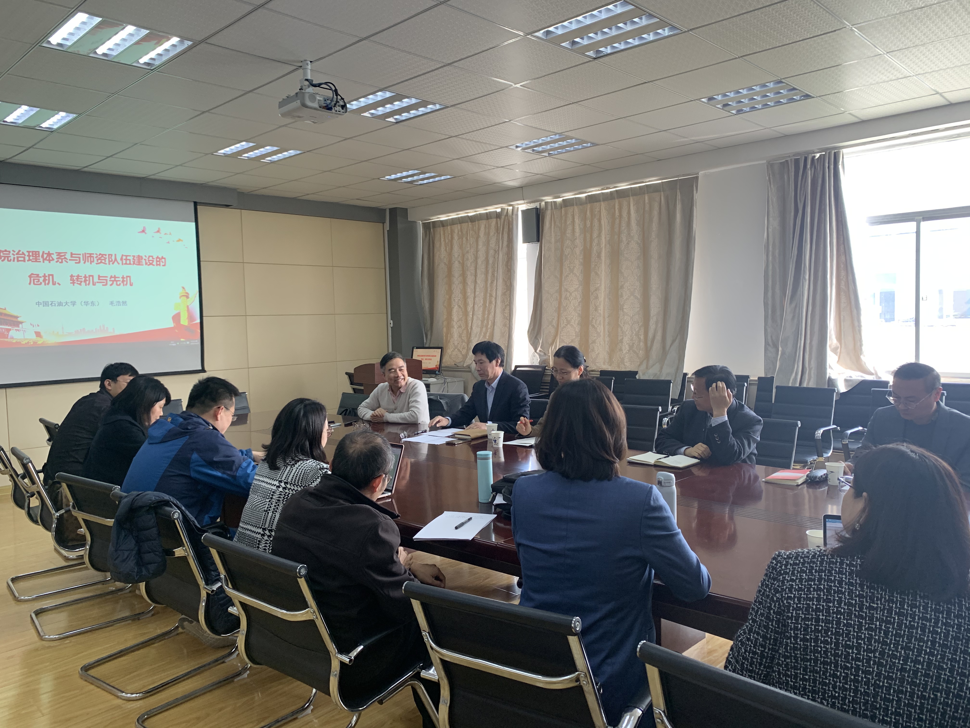 院长毛浩然教授作《学院治理体系与师资队伍建设的危机、转机与先机》专题辅导报告。院长尹洪山主持,学院班子成员、学院管理骨干和部分学术骨干参加。