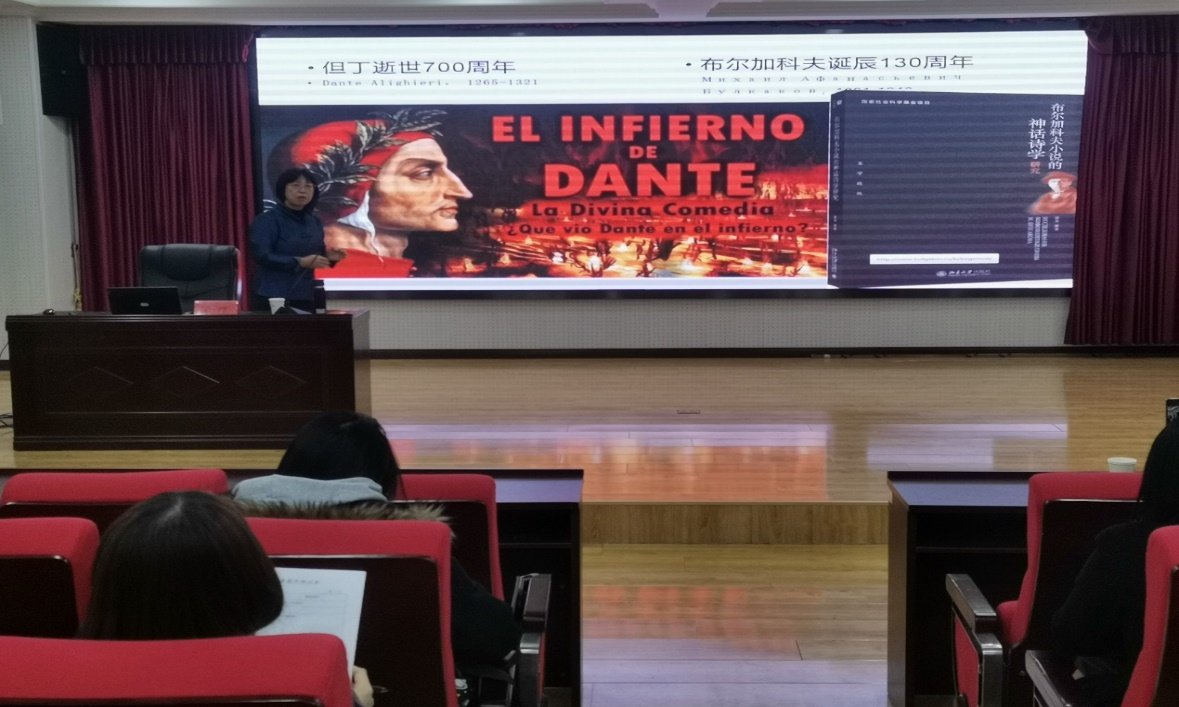 梁教授由布尔加科夫创作概况及其文学地位谈起,随后借助互文视角和巴赫金狂欢化理论从体裁风格、多声部结构(历史、魔幻、现实三重时空)、多重主题等方面对《大师与玛格丽特》这部小说进行深入分析,多角度、多层面具体详尽地诠释了作家的狂欢化叙事风格和诗学特征,为在场听众上了一场别开生面的文本分析课。在对小说剖析过程中,梁坤教授通过词源学追溯、俄罗斯宗教哲学观念、基督教知识解读了这部作品与欧洲和俄罗斯经典文学传统的密切联系及其深刻的哲学、文化意蕴,让在场听众深刻领略了这部作品厚重的人道主义特征。值得一提的是,梁教授在报告中运用了大量恰到好处的精美图片,为深奥的学术剖析增添了许多生动、鲜活的色彩。