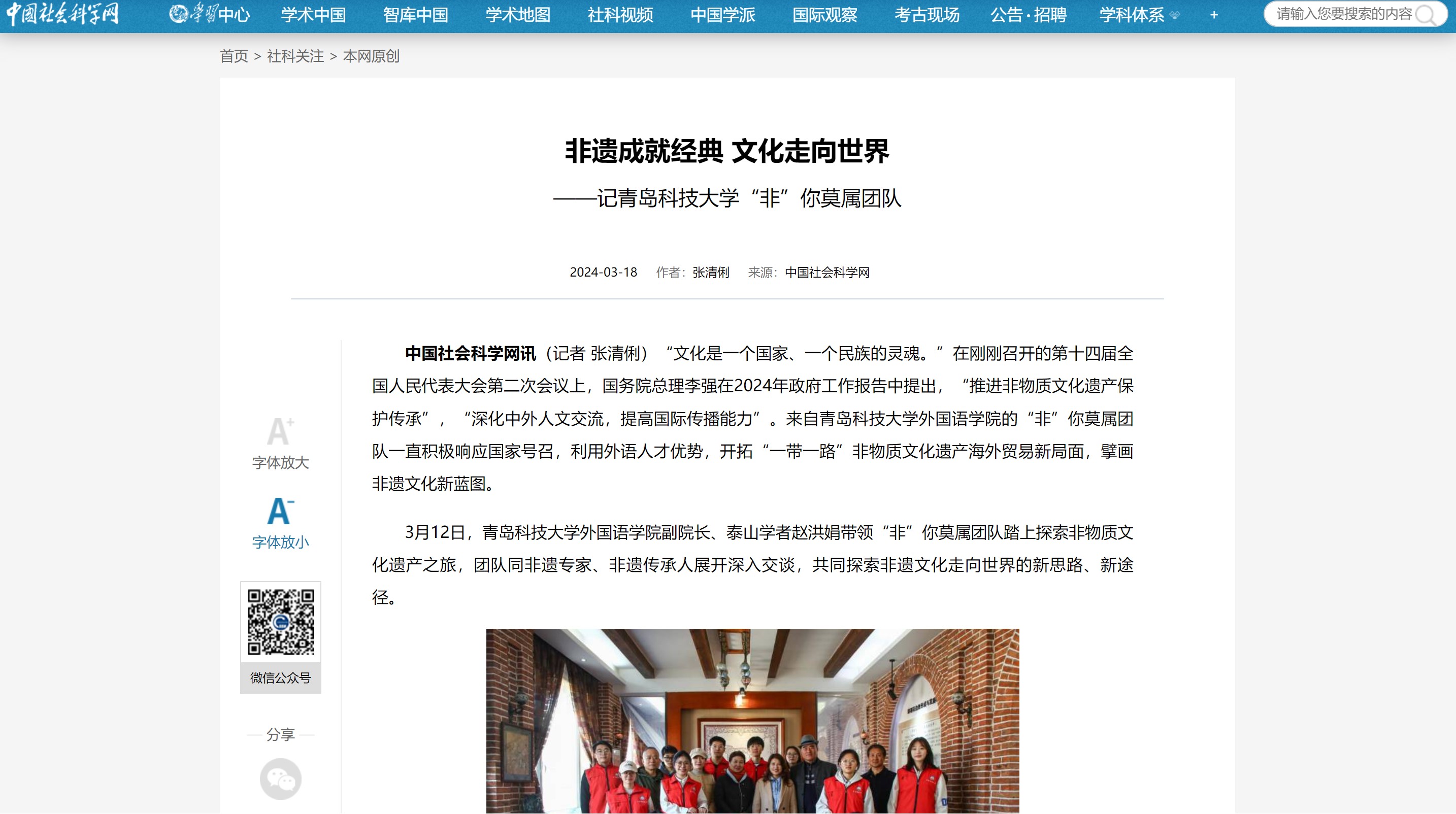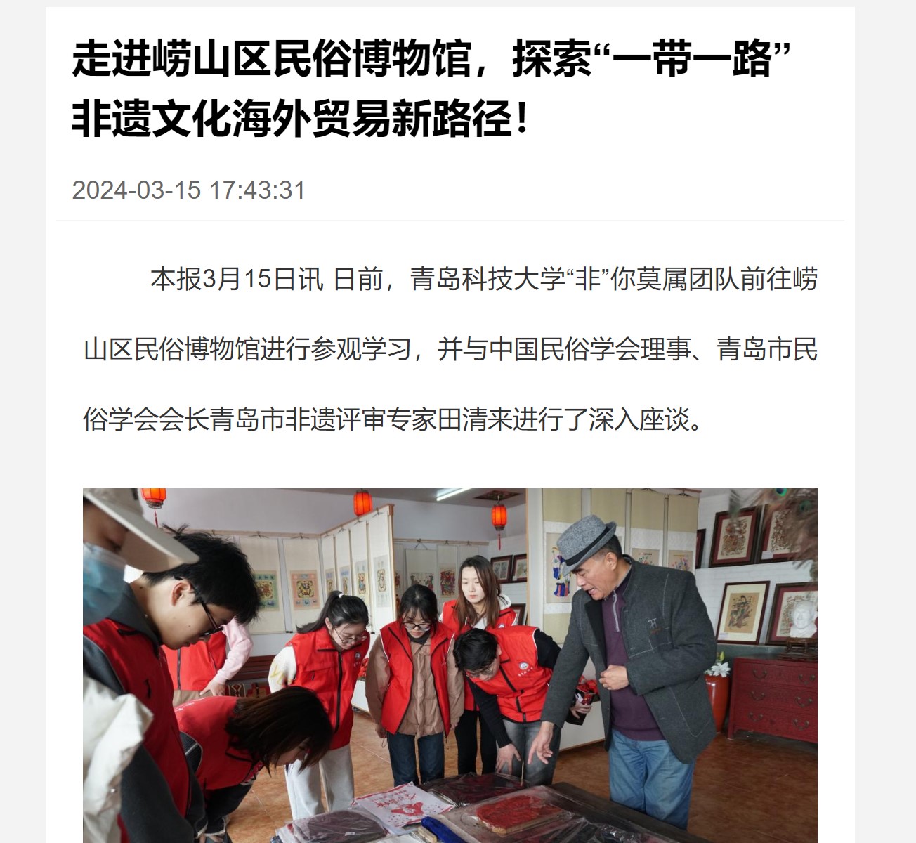 副院长,泰山学者赵洪娟教授指导带领的“非”你莫属团队积极响应时代号召,开启探索中国非物质文化遗产海外传播新征程。他们深入崂山区民俗馆、李沧区文化馆、即墨花边博物馆、即墨古镇等地,与数位非遗传承人展开深入交流,共同探索非遗文化走向世界的新思路新途径,争做“一带一路”非遗海外文化传播破局者。受到中国社会科学网、中国网、中广中文网、今日头条、半岛新闻、青岛市民俗学会、掌上青岛等国内多家媒体报道,引发社会广泛关注。