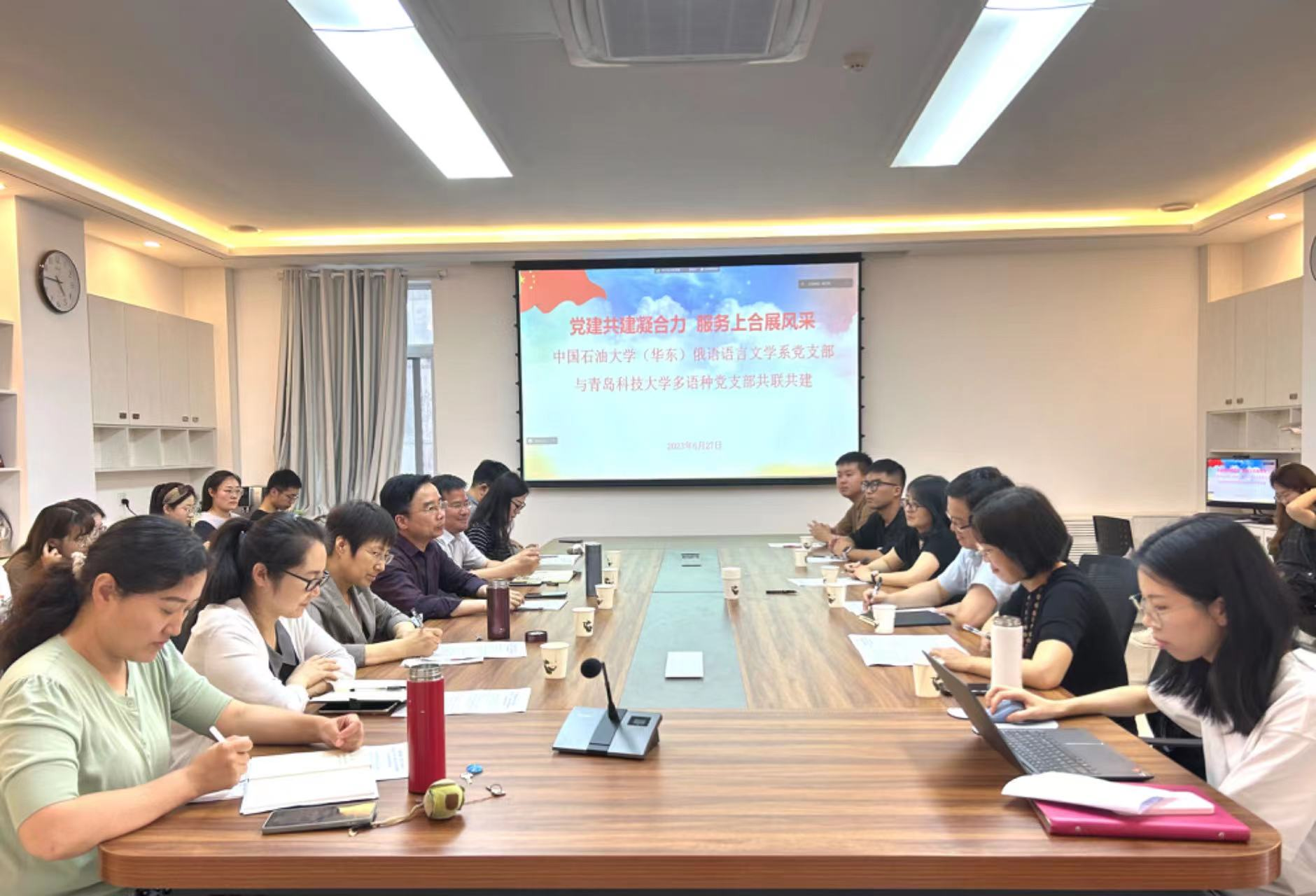 俄语语言文学系党支部开展了“党建共建凝合力,服务上合展风采”联建共建活动。学院党委统战委员、副院长刘靖与中国石油大学(华东)外语学院党委书记朱惠平、院长毛浩然出席活动,两党支部师生代表参加本次活动。