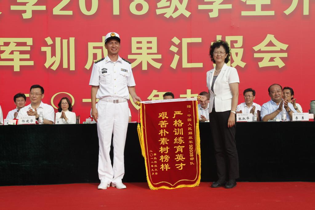 党委副书记张元利、副校长张淑华代表学校向92038部队赠送锦旗,副校长李勇在典礼上宣读了《青岛科技大学关于表彰2018级学生军训先进集体和优秀教官的决定》《青岛科技大学关于颁发2018年优秀新生奖学金的决定》。获奖的军训先进营、内务先进营、军训先进连、优秀教官代表,以及优秀政治教导员上台领奖。53名新生领取了新生奖学金,其中普通本科生29人每人奖励5000元,中德合作办学项目23人每人奖励30000元、中法合作办学项目1人奖励20000元。