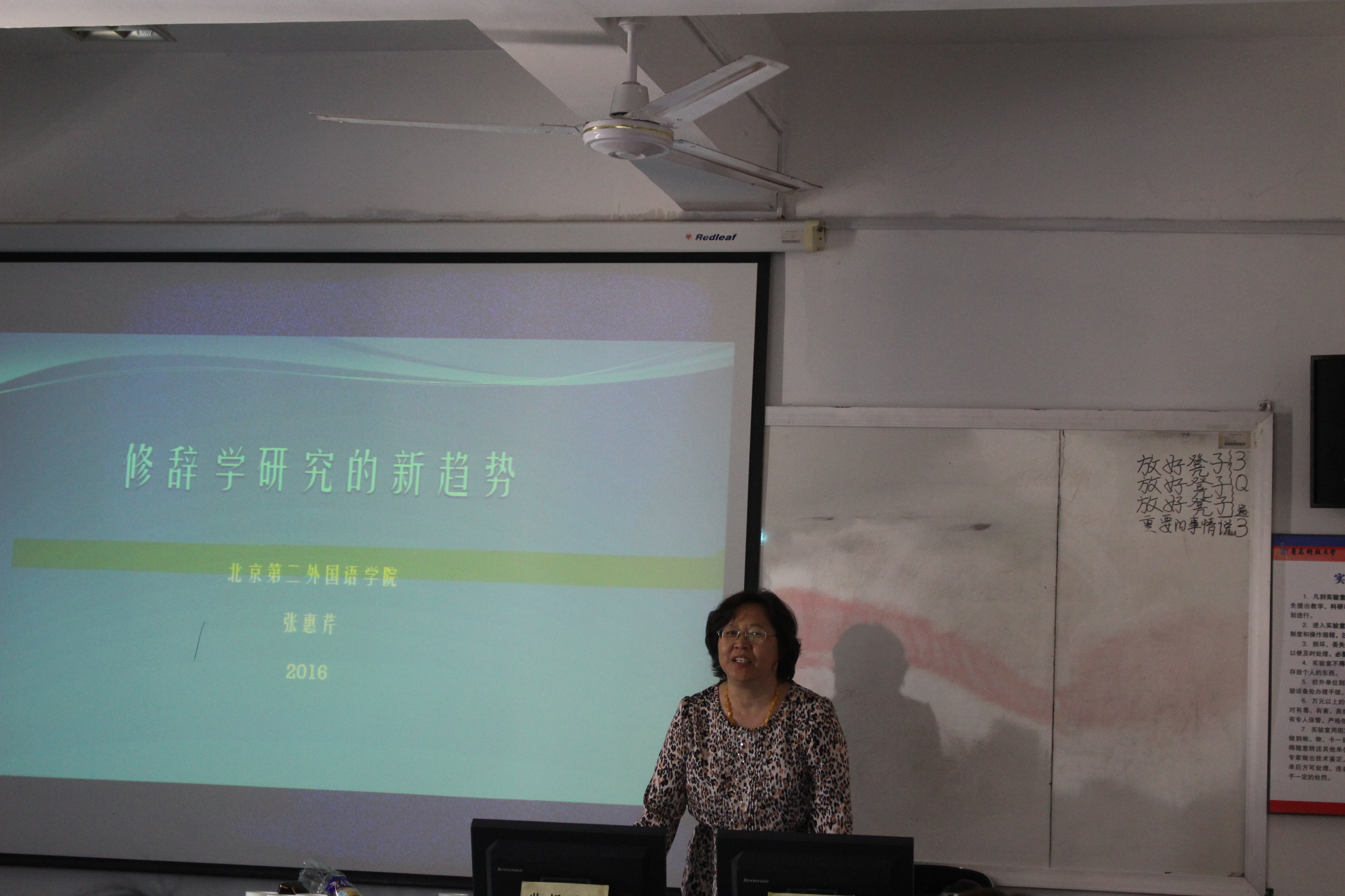 张惠芹教授首先介绍了俄语修辞学的基本分类及其概念。然后详细介绍了人文修辞学在俄罗斯的兴衰过程,宗教修辞学、媒体语言修辞学、法律语言修辞学、导游语言修辞学、广告语言修辞学等新领域的兴起。张教授指出,当代俄语修辞学的发展具有综合性、跨学科、多元化、人本性、得体性及深入化等特点及趋势。张教授在报告最后给大家介绍了当代俄语修辞学的研究成果及学术研究与交流平台等信息。张教授以渊博的专业知识和通俗易懂的讲解为师生们带来了一场学术盛宴。