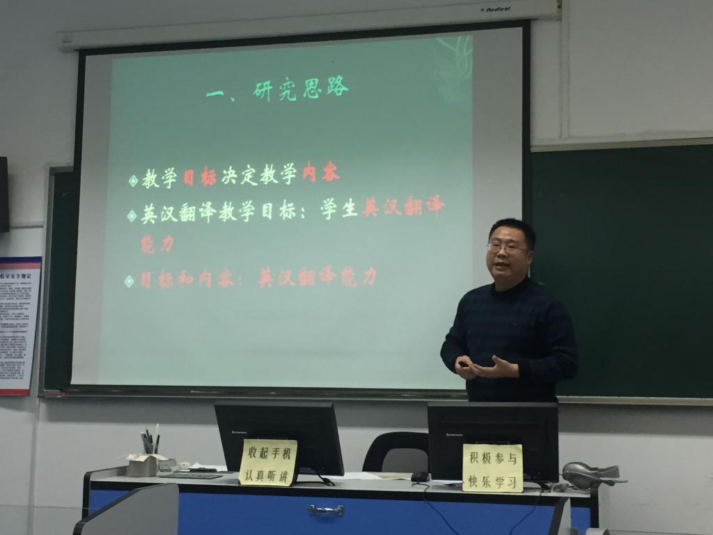 研究生论坛,在语音室418做了题为“英汉翻译教学探索—目标与内容”的报告。报告由吕耀中副院长主持,姜德杰书记,尹洪山院长,任素贞副院长,翻译硕士教育中心主任康宁及学院部分师生到场参加。