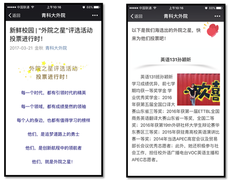 分团委开启了培优工程暨首届 “外院之星”评比活动,旨在表彰一批在学习、竞赛、创业、文体、服务等方面表现突出的优秀学生,充分发挥他们的榜样作用,帮助同学们挖掘自身优势与闪光点、增强外语人的自信、培养复合型的外语人才,鼓励学生多元成才,全面发展,在全院范围内营造良好的院风、学风和班风,形成“比学赶帮超”的浓厚氛围。