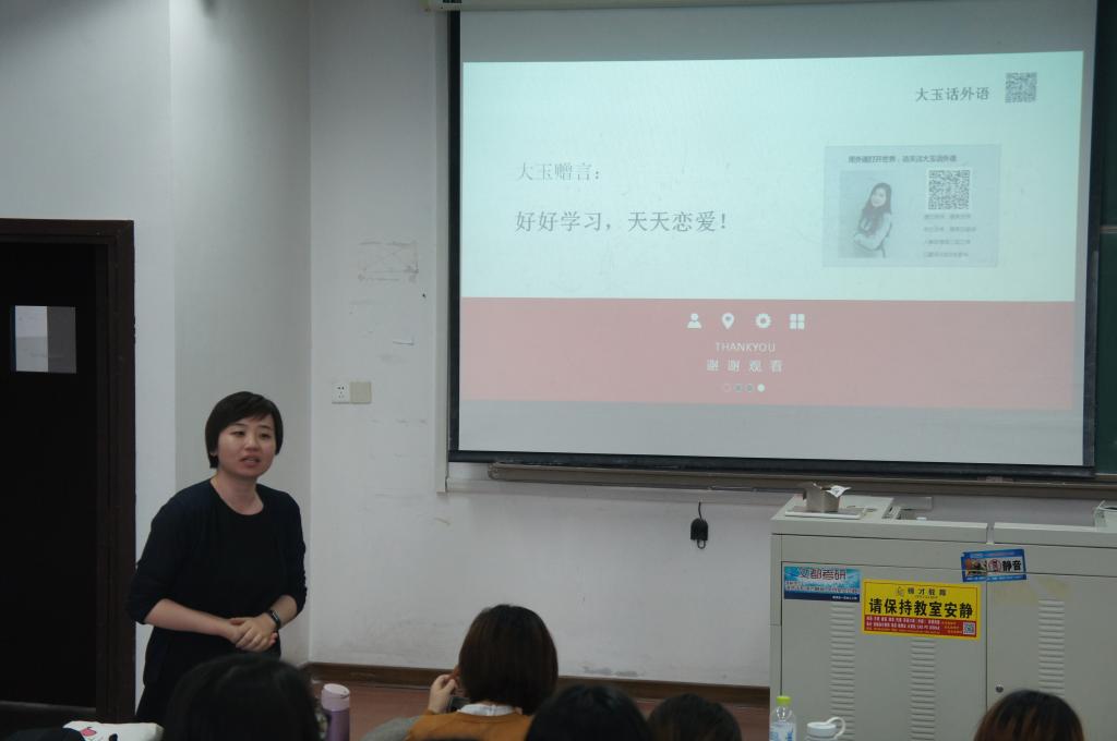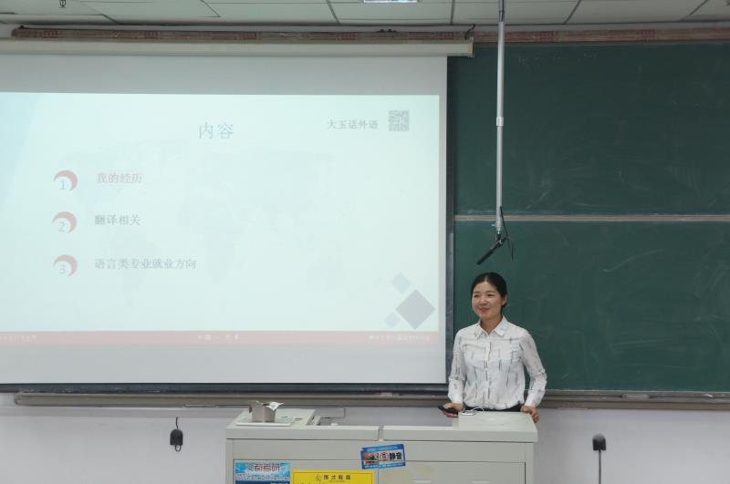 和德语系的邀请,德语系2010届优秀毕业生“中英德三语翻译官”高玉在明德楼422教室举办“外语打开世界——翻译之路及语言类专业就业方向”的主题讲座。会议由学院分团委书记贾明明主持,德语系系主任巫莉丽,德语系老师崔婕出席了此次活动。参加讲座的同学主要来自外语学院,还有慕名而来的中德学院机械以及应用化学专业的学生。