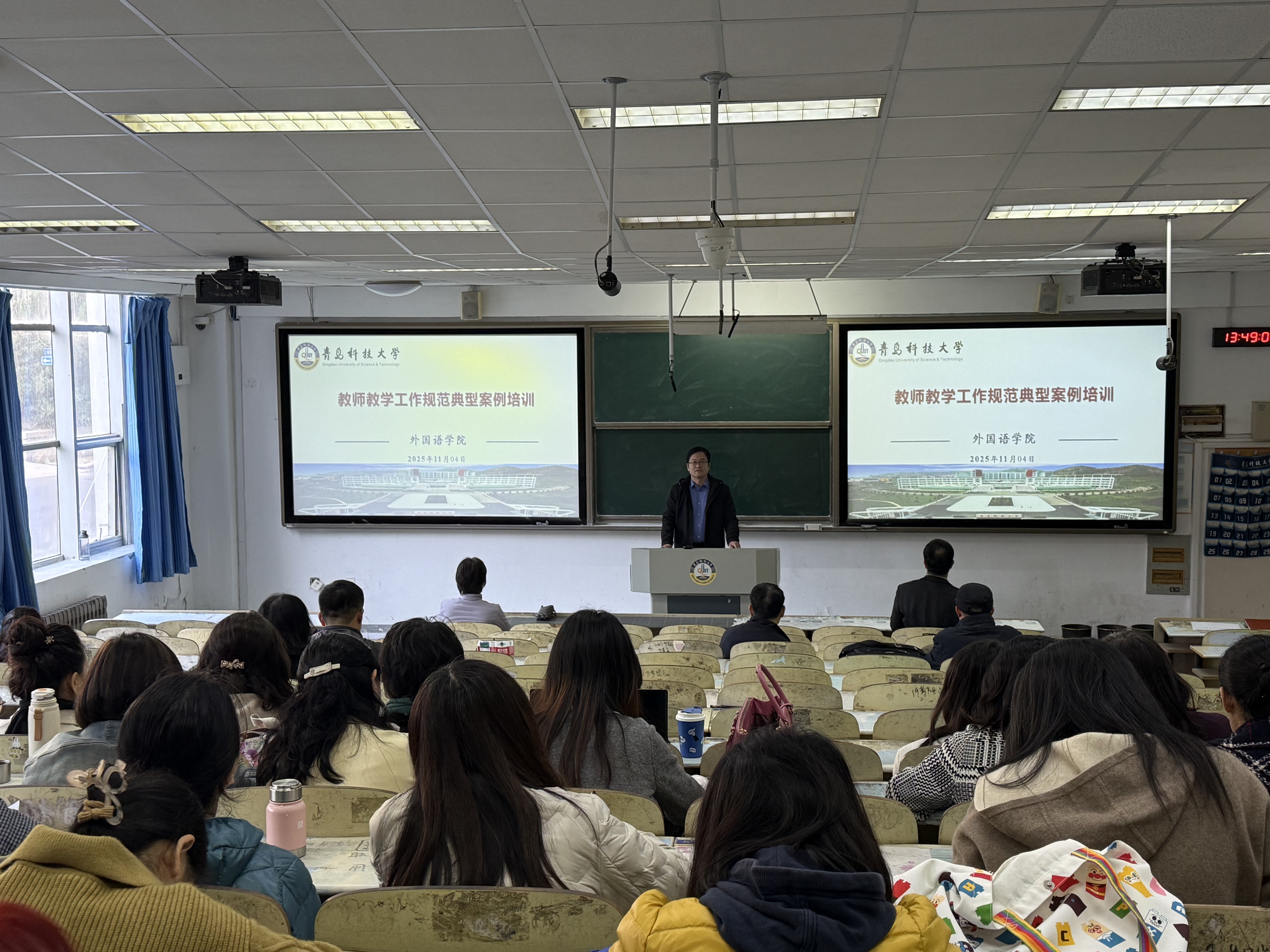 刘靖副院长结合《青岛科技大学教师教学工作规范(2022修订)》的具体条款,进行了深入浅出的典型案例培训。他选取了教学准备、课堂管理、考核评价、师德师风等关键环节中具有代表性的正反案例,进行了生动详实的剖析与解读,引导教师们明底线、知准则、强规范。培训内容紧密联系外语教学实际,针对性、指导性强,为教师们准确理解、自觉执行教学规范提供了清晰指引。