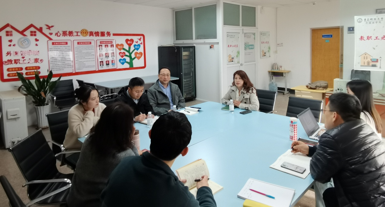 副院长赵洪娟、刘靖,院长助理孟婧及大学外语教学相关教研室负责人,智能制造学院副院长李剑光及高分子材料加工机械系相关负责人出席本次会议。会上,赵洪娟着重就外语教学与专业深度融合进行了规划,刘靖详细介绍了大学英语教学的整体情况、改革方向及实施举措,彰显了大学英语服务专业人才培养的坚定决心。