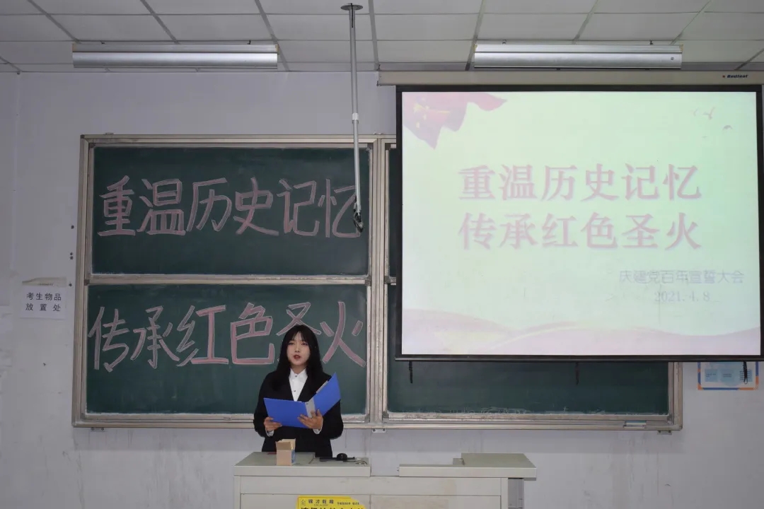 活动伊始,全体同学观看了红色电影,学唱红色歌曲《如你所愿》,重温历史记忆。红歌、红色电影里的党史,是共产党人奋斗的历程,也是中国人民站起来的生动描绘,让广大青年学生切身感受艰辛历程、巨大变化、辉煌成就。活动最后,全体同学起立庄严宣誓,重温入团誓词,将自己的一腔报国热情和为中国梦添砖加瓦的决心融入进了铿锵有力的话语中。大家纷纷表示一定要铭记历史,以革命先烈为榜样,以昂扬姿态奋力开启全面建设社会主义现代化国家新征程,以优异成绩迎接建党一百周年。