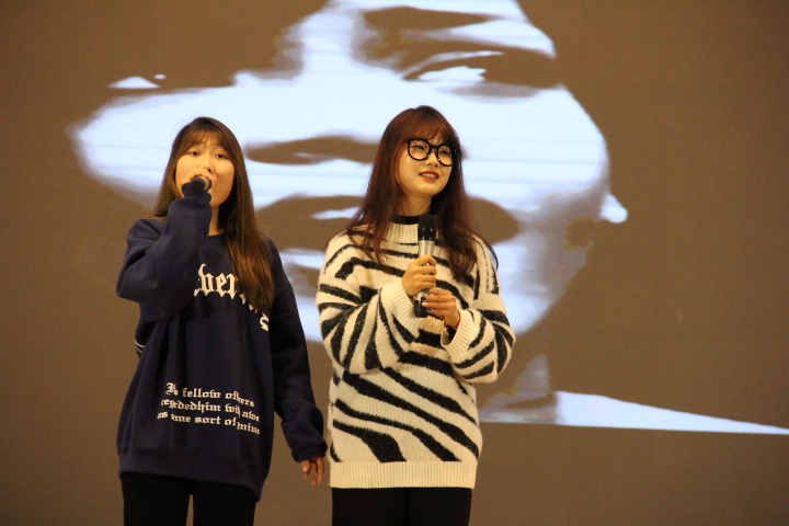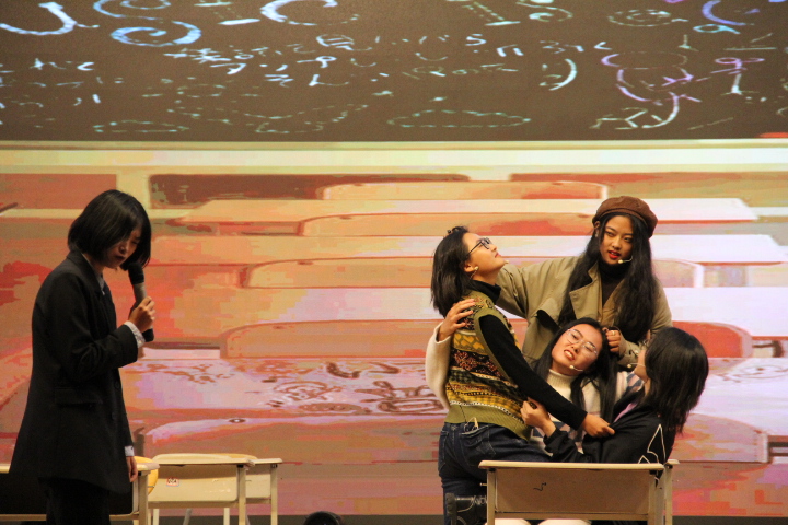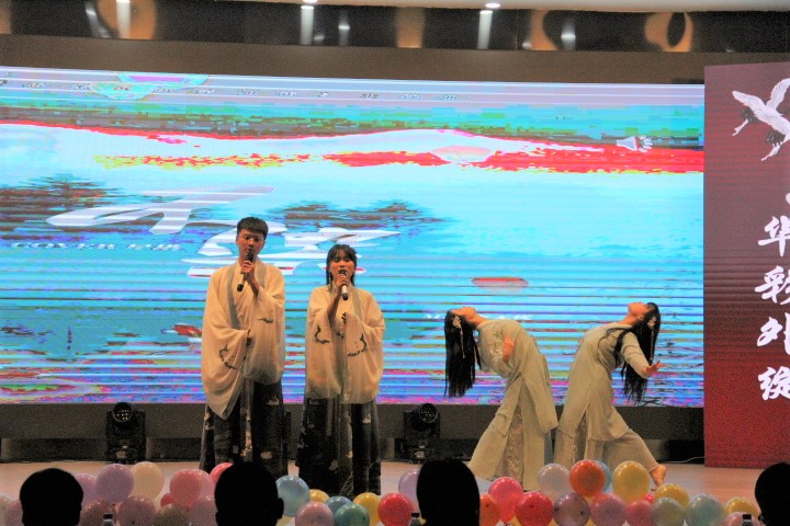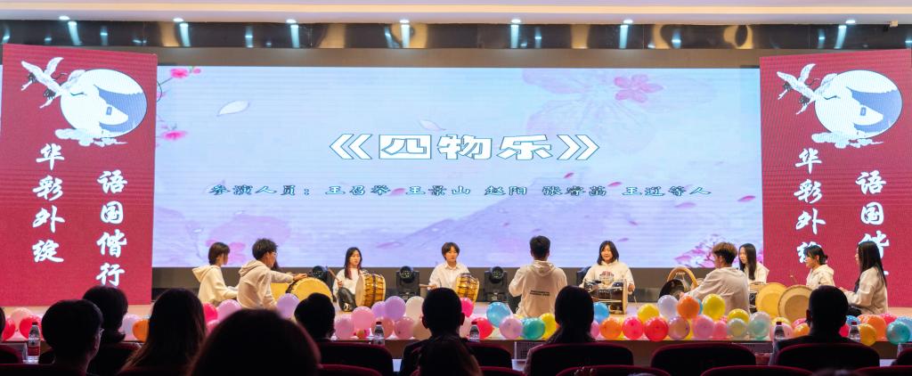 节目开始前首先播放了新生寄语、外院小故事与学生会成员风采展示三段小视频。在新生寄语中,院领导表达了对新生的热烈欢迎与殷切期望;外院小故事记录了外院学子的日常点滴,展现了新生勤奋好学,团结奋斗的良好形象;在欢快的音乐中,大屏幕还依次介绍了学生会成员。倒计时后,晚会正式开始。开场的第一个节目是韩国传统乐器演奏《四物乐》。长鼓圆鼓咚咚作响,小锣大锣锵锵齐作。在锣鼓的和鸣中,带给观众们浓浓的异国气氛,渲染了现场热烈和谐的气氛。