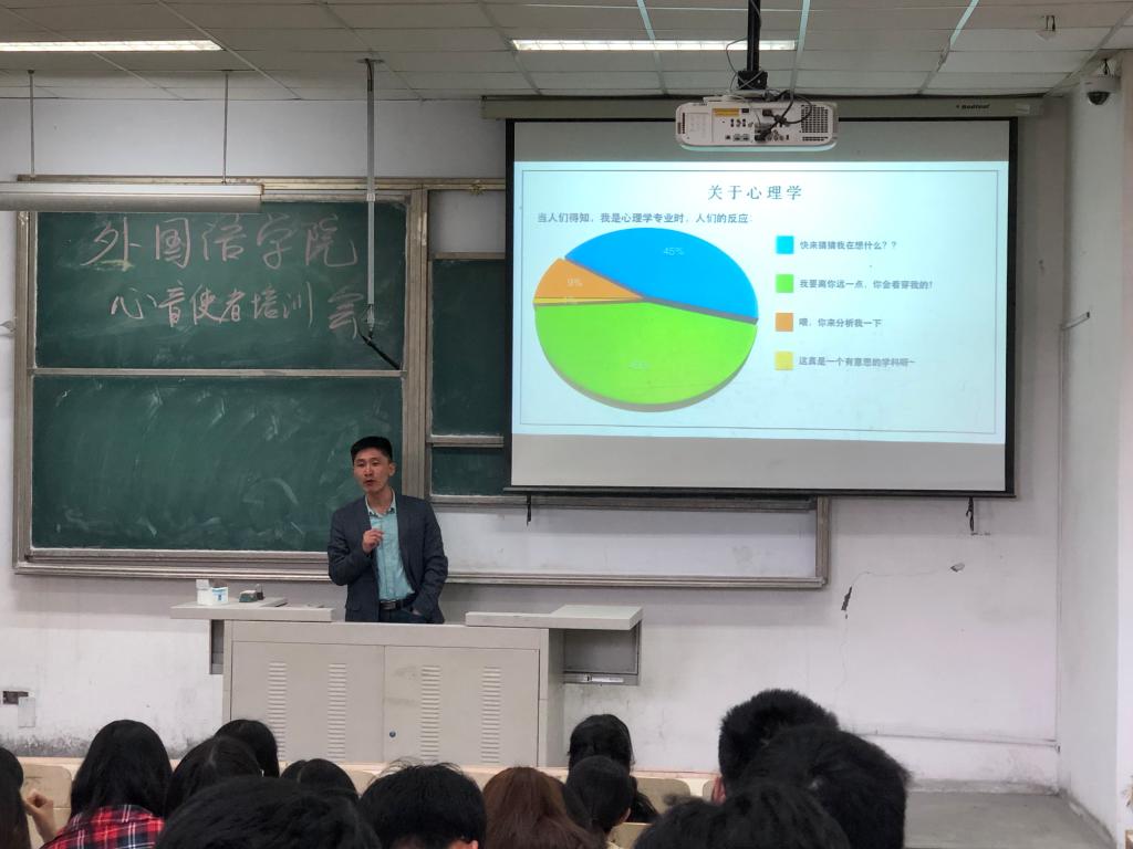 在弘毅E102举办学院心音使者培训会,心理工作站站长贾明明为学院全部心理委员进行了培训。