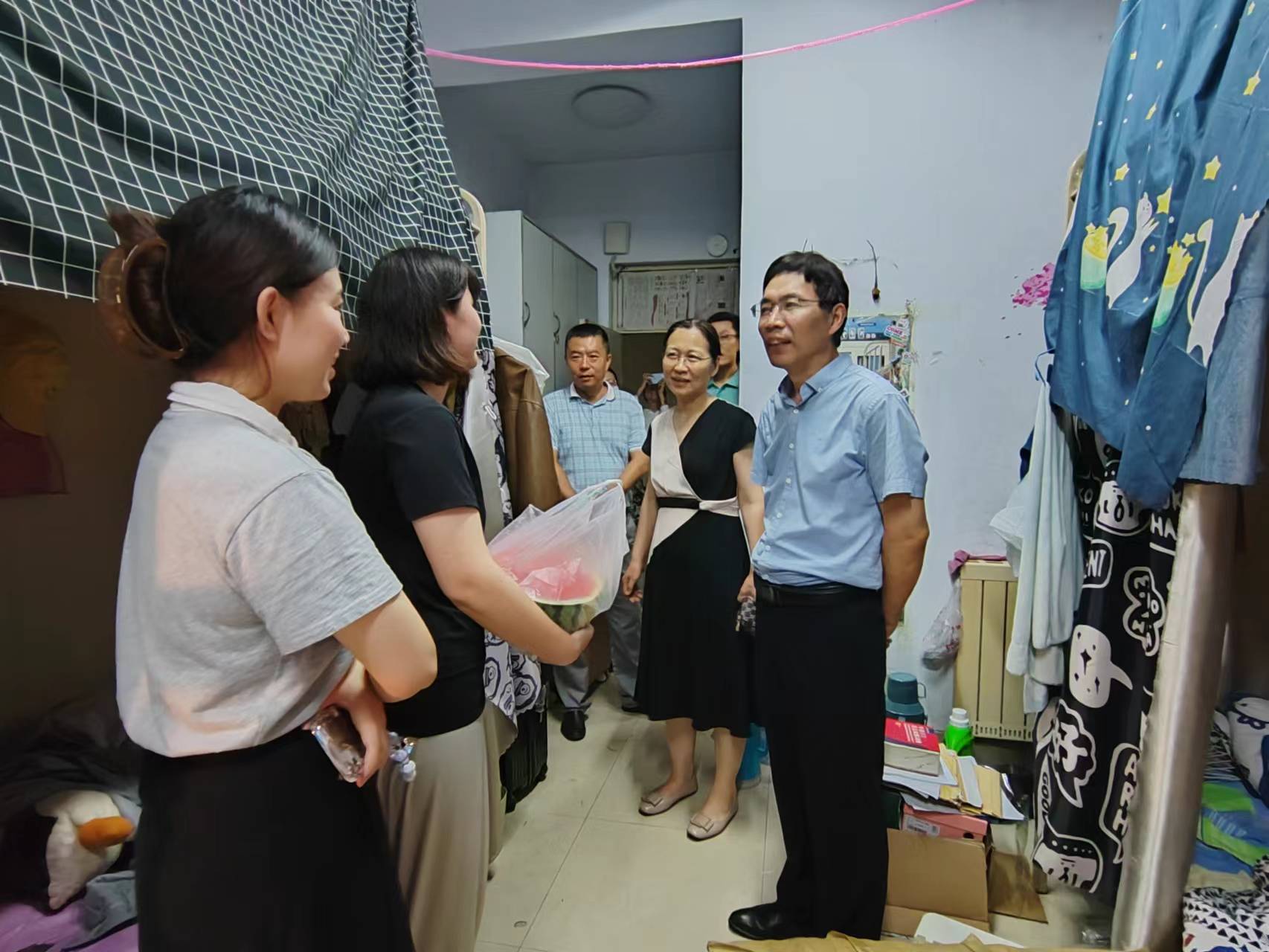 学院领导老师走到各毕业生宿舍,进行了深切的慰问和祝福,并为他们送上炎炎夏日里的一股清凉,清甜的西瓜给大学生活划上圆满的句号。同时学院给每位毕业生定制了印有前程似锦的帆布包,寄托着对外院学子最美好的期盼。