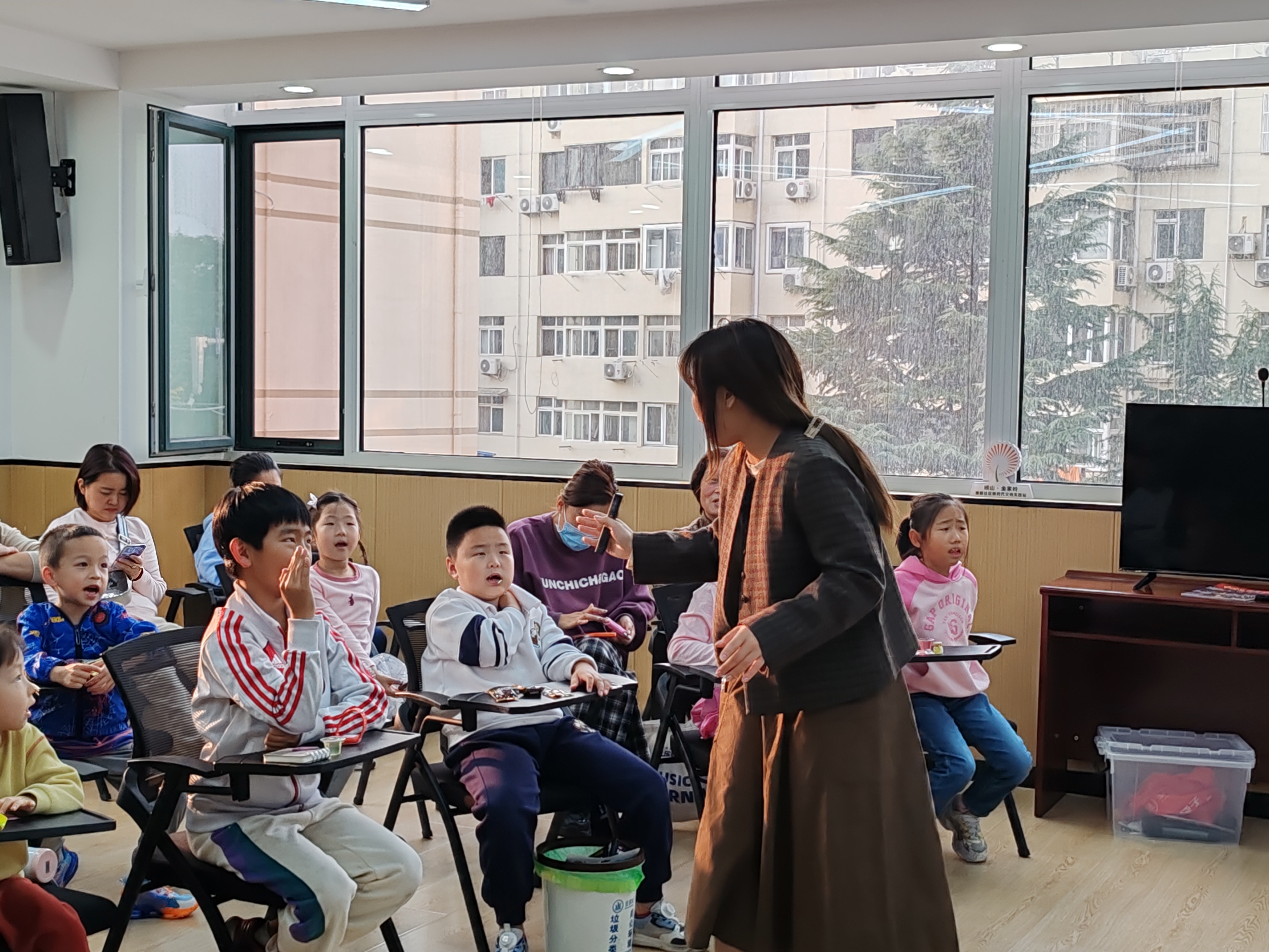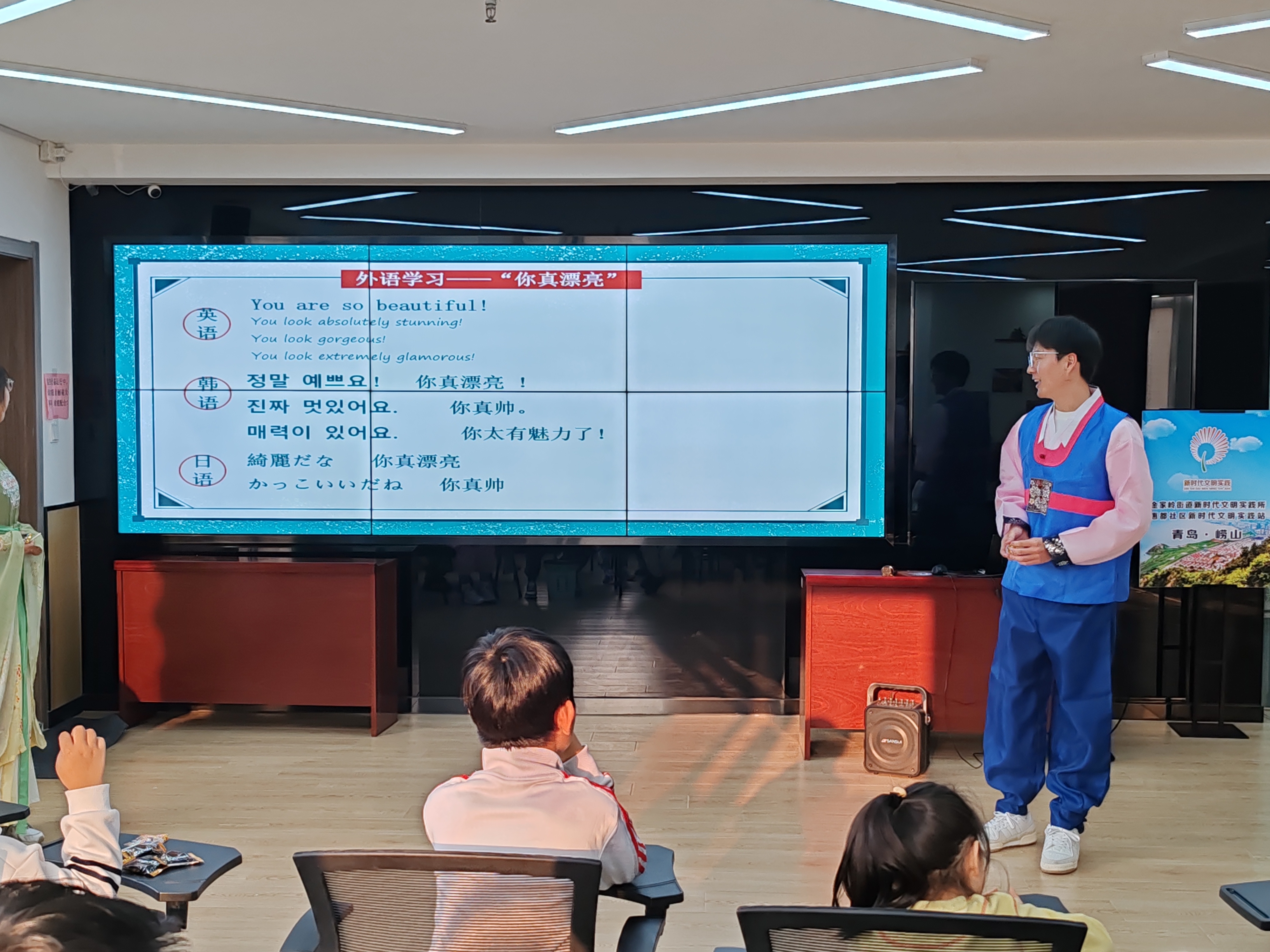 志愿者们还带领小朋友学习了在日常生活中用英语,日语,韩语夸赞其他人的说法,小朋友们能做到迅速地掌握和应用。