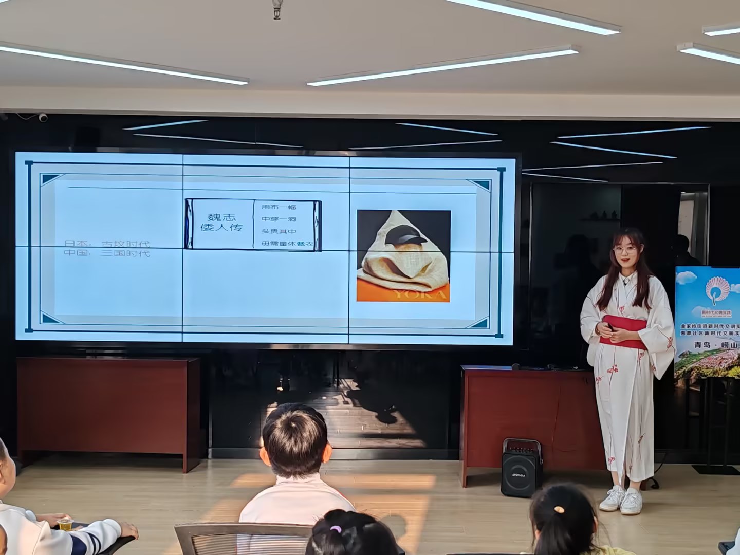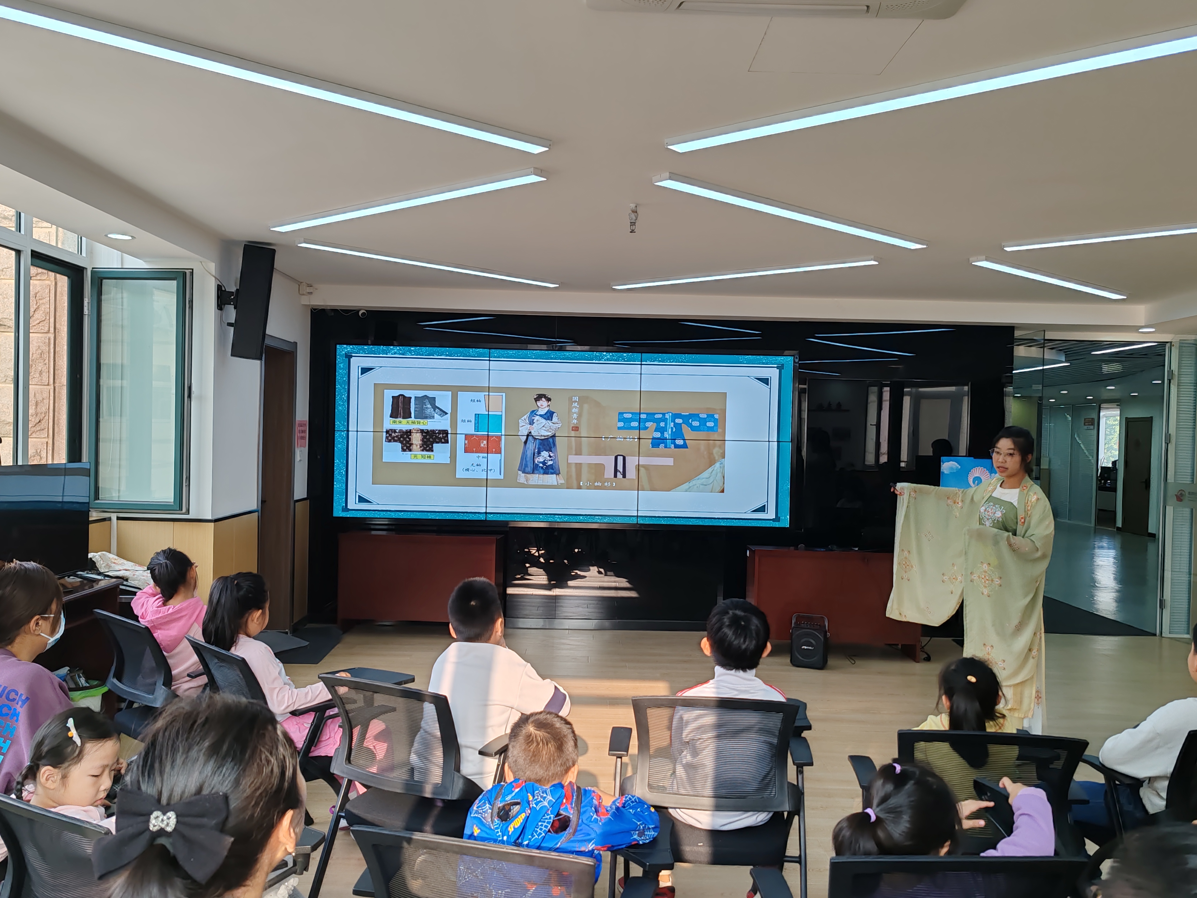 志愿者们讲解的内容以服装的重要性和差异性为核心,重点带领小朋友们了解了汉服的发展历程与特点,同时还学习了汉服、和服与韩服的区别。在学习的过程中,小朋友们认真听讲,踊跃回答志愿者们提出的问题,课堂氛围十分活跃。