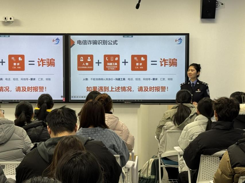 开展“防范电信网络诈骗”专题活动。本次活动特邀崂山公安分局金家岭派出所民警现场授课,以“案例剖析+知识普及+实操指导”的形式,系统解读电信网络诈骗的新套路,为同学们带来了一堂兼具专业性与实用性的安全知识盛宴。