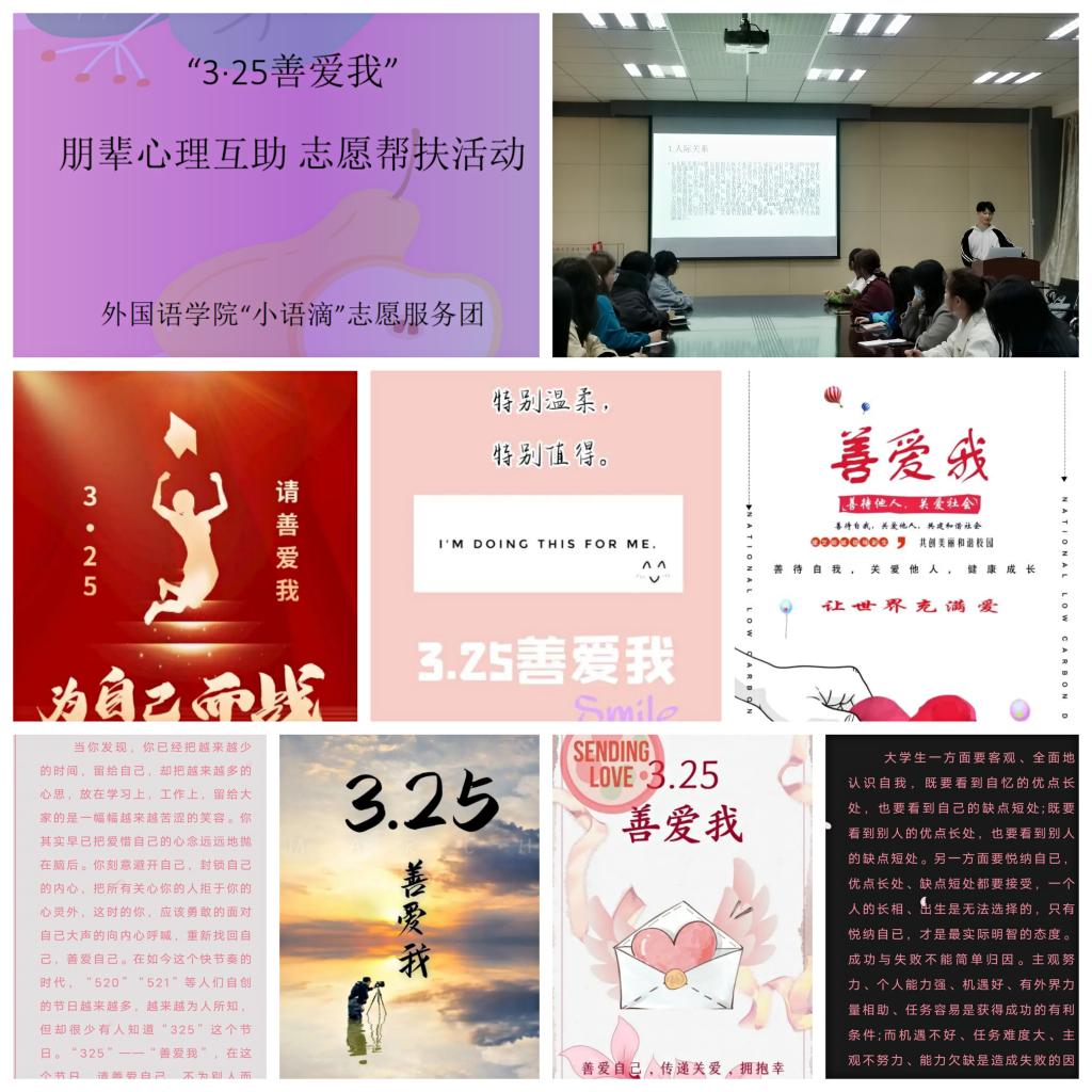 “3·25”谐音“善爱我”,倡导大学生善待自我、关爱自我,怀着温暖、包容的情意欣赏和接纳自己;以积极、豁达的心态面对生活,爱他人,爱自然,爱社会。