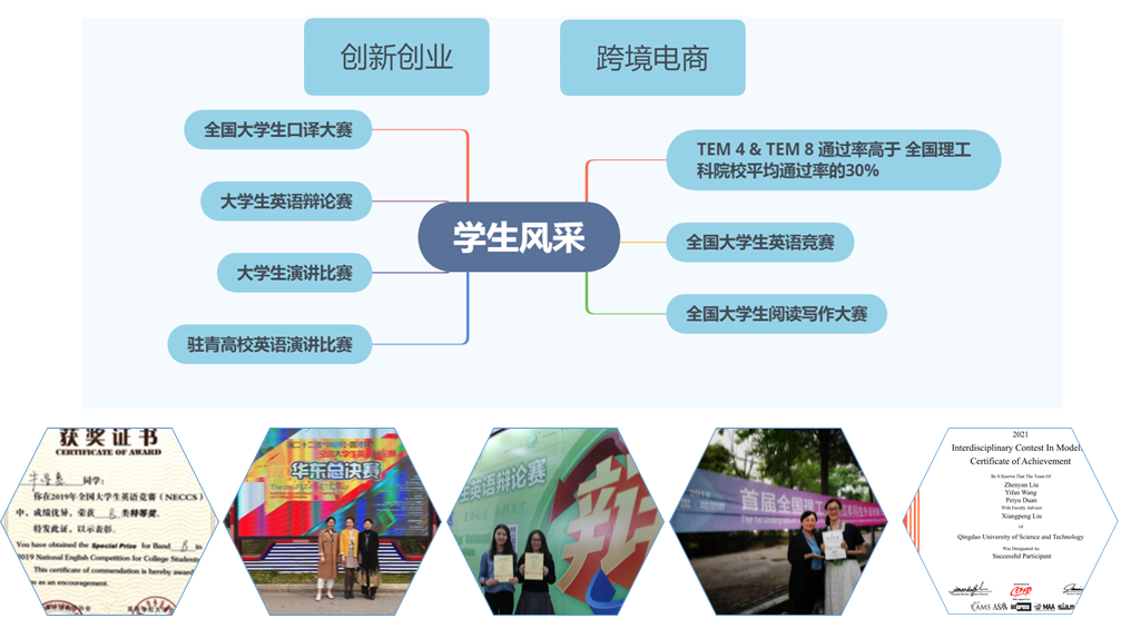 特色鲜明的专业设置形成了人才培养的优势。在历年的英语专业四级和专业八级考试中,一直保持高通过率,高于全国理工科院校平均通过率30%以上。学生每年都有机会参加全国大学生英语竞赛、全国大学生阅读写作大赛、大学生演讲比赛、大学生英语辩论赛、全国口译大赛等各种赛事,提升专业能力和综合素质。专业教师会给参赛选手进行一对一的辅导,培养出一大批成绩显赫的赛手。